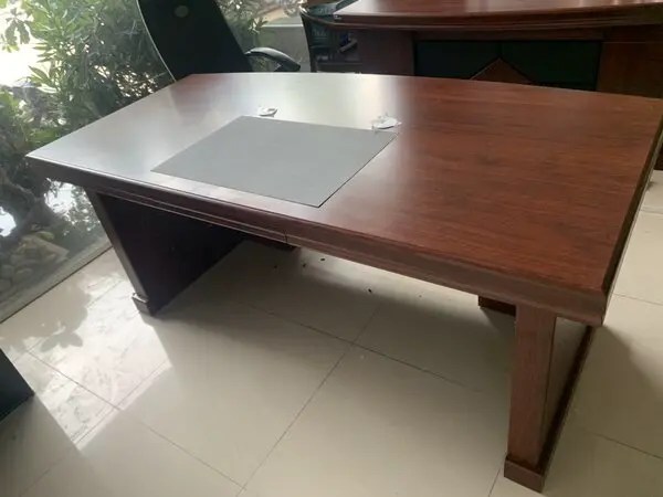 Bàn lãnh đạo mặt lượn cong, yếm bàn ốp nổi tấm PVC đen. Chân bàn ghép hộp chữ L phía trước soi chỉ sơn đen trang trí