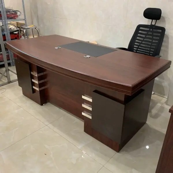 Bàn lãnh đạo mặt bàn lượn cong có tấm PVC trang trí. Chân bàn được trang trí ốp nổi.